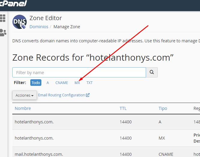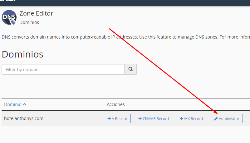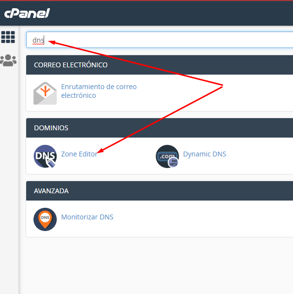 En el cPanel, digitar "dns", y luego clic en Zone Editor.
