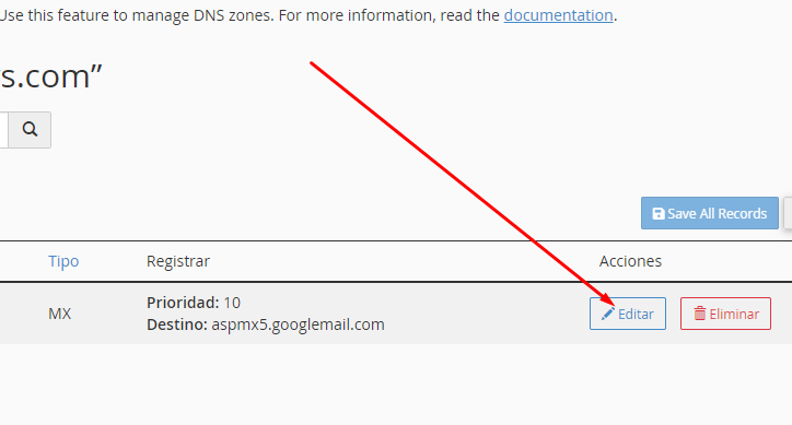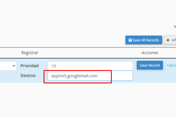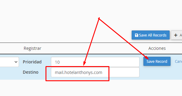Y reemplazar por: mail.tudominio.com y clic en Save Record