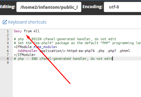 En la parte superior, y renglón aparte ????, pegar: Deny from All