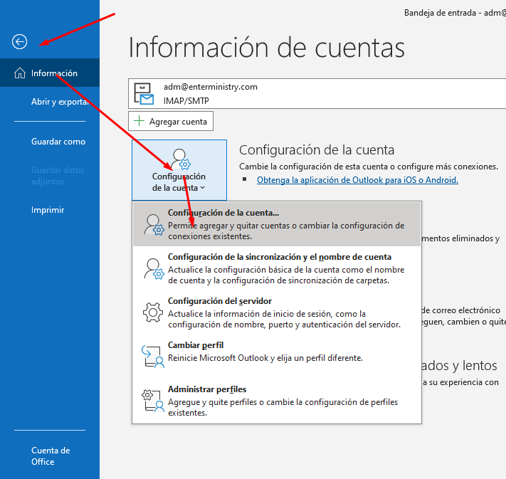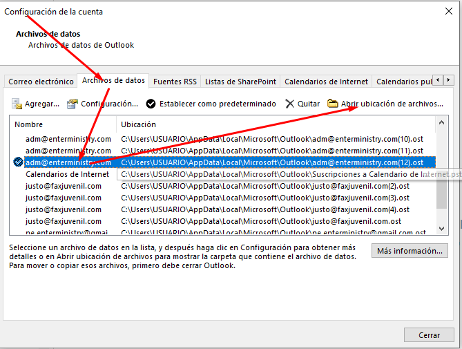 Clic en Archivo de datos, clic en mi cuenta de correo, clic en Abrir ubicación de archivos